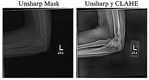 thorough analysis, four images in an incompatible format were identified and excluded in subsequent preprocessing stages, thereby confirming the total of 40,005 images reported by the authors [23]. The resulting 40,005 images were normalized and resized to 384 × 384 pixels to maintain a balance between preserving relevant details, ensuring computational efficiency, and achieving consistency with the pre-trained models. To improve the visual quality of the radiographs, the Unsharp Masking technique, used to emphasize edges and fine details [24], and CLAHE, which improves contrast in low-quality images without introducing unwanted artifacts [25], were applied. Previous studies have shown that combining these techniques significantly enhances visibility in low-light images [26], as illustrated in Figure 2.