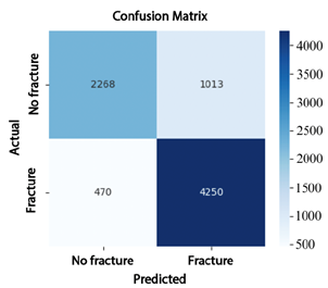 As shown in Table 8, ConvNeXt-Large outperforms EfficientNet-B4 and ResNet-50 across all evaluated metrics, achieving a precision of 99.2%, a sensitivity of 97.7%, and an F1-score of 98.4%, demonstrating its strong ability to classify bone fractures with a low false positive rate. In contrast, EfficientNet-B4 and ResNet-50 performance but lower effectiveness in correctly identifying positive cases. These results indicate that ConvNeXt-Large provides the best balance between precision, sensitivity, and generalization capability.