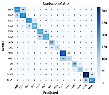 Conversely, Figure 14 shows that ResNet-50 achieves improved classification performance; in this case, most classes are correctly concentrated along the diagonal of the confusion matrix, although misclassifications between Normal Shoulder and Abnormal Wrist remain.