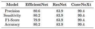 Table 4 summarizes the configurations used for EfficientNet-B4, ResNet-50, and ConvNeXt-Large, including the number of epochs, batch sizes [36], and learning rates, with specific adjustments for multiclass classification.