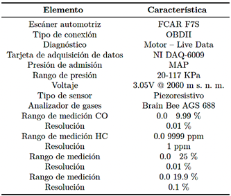 La propuesta presentada tiene como finalidad principal evitar el desmontaje de componentes y sistemas del vehículo, posibilitando la detección de fallos y la predicción de emisiones de gases de escape mediante un enfoque mínimamente invasivo. Para alcanzar este objetivo, se lleva a cabo la adquisición de muestras de la depresión generada en el motor de encendido provocado (MEP), utilizando como fuente de información la señal de voltaje emitida por el sensor de presión absoluta del colector (MAP). En la Tabla 1 se muestran las características técnicas del motor MEP empleado en el estudio; por otro lado, la Tabla 2 presenta la instrumentación utilizada durante el proceso experimental.