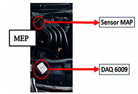 La Figura 1 ilustra los componentes fundamentales empleados en el presente estudio, los cuales incluyen el sensor de presión absoluta del colector (MAP), la tarjeta de adquisición de datos DAQ-6009 y una computadora portátil utilizada como unidad de procesamiento. Por su |