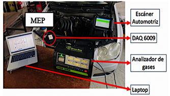 El sensor MAP instalado en la unidad experimental fue utilizado para capturar la señal de voltaje, debido a su ubicación estratégica en el colector de admisión del motor de encendido provocado (MEP). Paralelamente, se recolectaron muestras correspondientes a las emisiones de gases de escape, que incluyeron monóxido de carbono (CO) y dióxido de carbono (CO2), ambos expresados en porcentaje; hidrocarburos no quemados (HC) expresados en partes por millón (ppm); y oxígeno (O2), también expresado en porcentaje. Esta información fue obtenida mediante el uso de un analizador de gases, mientras que la señal del sensor MAP fue adquirida a través de la tarjeta DAQ-6009 en conjunto con el software LabVIEW 2024, lo que permitió realizar un monitoreo en tiempo real. Durante la recolección de datos, tanto la señal del sensor MAP como las emisiones de gases se registraron a un régimen constante de 2500 rpm bajo condiciones de prueba estática en la unidad experimental. La temperatura operativa del motor MEP se mantuvo en un intervalo de 90 a 98° y se utilizó un escáner automotriz |