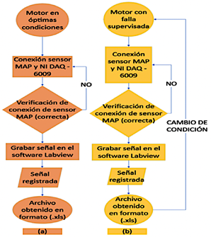Figura 4. Diagrama de flujo para el proceso de toma de muestras: (a) motor con óptimas condiciones, (b) motor con falla inducida