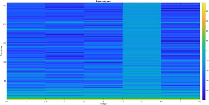 en 250 fragmentos. Adicionalmente, se implementó un algoritmo en el entorno Matlab para la generación automatizada de espectrogramas, obteniéndose un total de 200 espectrogramas distintos por tratamiento. La configuración utilizada incluyó una frecuencia de muestreo de 10 kHz, un tamaño de ventana de 512 muestras para el análisis espectral y una superposición de 128 muestras entre ventanas sucesivas. Para determinar los espectrogramas más adecuados como entrada para la red neuronal convolucional (CNN), se llevó a cabo un análisis detallado de los 200 espectrogramas generados por cada tratamiento, tal como se muestra en la Figura 6. La zona de menor actividad energética observada aproximadamente entre 3,5 y 4,5 s puede indicar una condición transitoria, es decir, un evento asociado a una perturbación en la señal MAP, como podría ocurrir ante la presencia de un fallo en el MEP. |