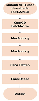 La Figura 10 muestra el esquema de la red neuronal convolucional desarrollada para la predicción de emisiones contaminantes en motores Otto, a partir de espectrogramas obtenidos del sensor MAP. La arquitectura inicia con una capa de entrada que recibe imágenes de tamaño 224×224×3 píxeles, seguida de tres bloques secuenciales Conv2D + Batch Normalization + MaxPooling2D, encargados de extraer y reducir la dimensionalidad de las características espacio-frecuencia presentes en los espectrogramas. Posteriormente, la red incluye una capa de aplanamiento (flatten), que convierte los mapas de características en un vector unidimensional, el cual es procesado por una capa densa (fully connected), para finalmente generar las predicciones mediante una capa de salida con función de regresión multivariable. Esta configuración asegura una extracción jerárquica eficiente de patrones relevantes para la estimación precisa de las emisiones de CO, CO2, HC y O2.