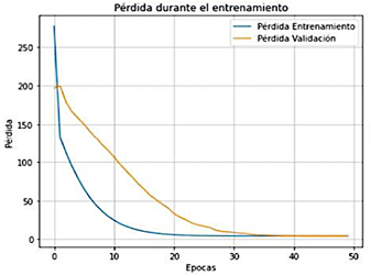 En la Figura 12 se observa la variación de la pérdida durante el entrenamiento de la red neuronal convolucional (CNN). Como es habitual en este tipo de redes, el valor de pérdida inicia en un nivel alto, pero disminuye con rapidez conforme el modelo se ajusta a los datos. Este descenso progresivo indica que la red está aprendiendo correctamente y adaptando sus parámetros de manera eficiente a lo largo del proceso de entrenamiento.