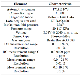 Figure 3 presents the main physical components used to diagnose faults in components and actuators and to predict exhaust gas emissions. These elements include an automotive scanner, the DAQ-6009 data acquisition board, a Brain Bee gas analyzer, and a laptop computer.