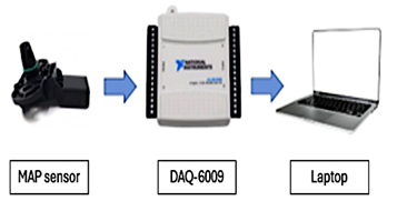 Figure 1 illustrates the main components used in this study, including the manifold absolute pressure (MAP) sensor, the DAQ-6009 data acquisition board, and a laptop computer serving as the processing unit. Figure 2 shows the connection scheme established between the DAQ-6009 board, the MAP sensor, and the experimental unit selected for testing, specifically a 2011 Volkswagen Jetta vehicle.