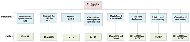 relying exclusively on the MAP sensor signal, the proposed approach remains minimally invasive, since exhaust ducts are not manipulated, additional intrusive sensors are not required, and overall system complexity is reduced. In accordance with this recommendation, the DAQ- 6009 board was configured with a sampling rate of 5 kHz for the samples to read parameter, an acquisition frequency of 10 kHz, and a duration of 5 s for each experimental treatment, using a differential connection mode. The data-collection order was planned in Minitab through a design of experiments (DOE). Accordingly, eight base treatments were defined, and to increase the statistical robustness and representativeness of the dataset, ten replicates were performed for each treatment [1].