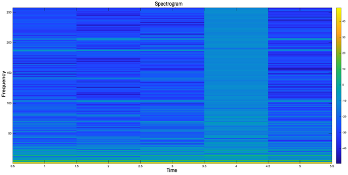 implemented in the MATLAB environment to automatically generate these representations, yielding 200 different spectrograms per treatment. The configuration used a sampling frequency of 10 kHz, a window size of 512 samples for spectral analysis, and an overlap of 128 samples between successive windows. To determine the most suitable spectrograms to be used as input for the convolutional neural network (CNN), a detailed analysis of the 200 spectrograms generated for each treatment was performed, as shown in Figure 6. The region of lower-energy activity observed approximately between 3.5 and 4.5 s may indicate a transient condition, that is, an event associated with a disturbance in the MAP signal, as could occur under a fault condition in the MEP engine. |