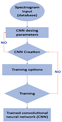 into spectrograms, the relevant engine information is encoded in time–frequency energy patterns that exhibit complex structures. Such patterns cannot be captured adequately by traditional models such as SVMs, decision trees, or fully connected neural networks. CNNs, owing to their architecture based on convolutional filters, enable automatic extraction of hierarchical spatial features from spectrograms, thereby identifying subtle variations associated with pressure dynamics, combustion irregularities, and fault-related effects in the intake, injection, or ignition systems. Because the model input consists of images, CNNs represent the standard approach for processing this type of data. Unlike feed-forward ANNs or models based on SVM or Random Forest, CNNs learn directly from the spectrograms through convolutional filters that capture high-frequency patterns, concentrated energy regions, and temporal structures corresponding to different fault modes. Figure 8 presents the CNN architecture, in which images are processed through filters applied across successive convolutional layers. Each layer extracts progressively more complex features, enabling a hierarchical representation of the relevant information and facilitating interpretation of the visual content. |