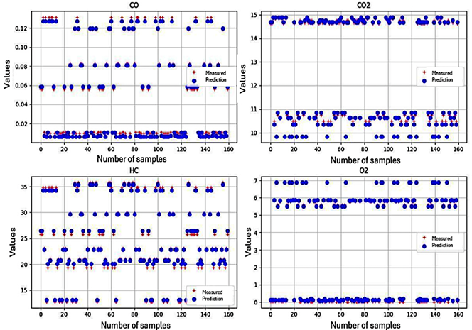Figure 14. CNN prediction results for CO, CO2, HC, and O2 emissions |