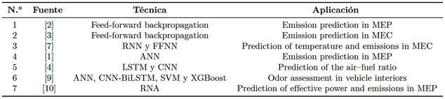 Currently, emissions from alternative internal combustion engines (MCIA) are among the most significant sources of atmospheric pollution in urban areas worldwide. These emissions degrade air quality and pose an environmental challenge of increasing concern. In contrast, in spark-ignition engines (MEP) the air fuel mixture is not always completely burned during the ignition phase due to inefficiencies arising from variations in temperature and load, changes in engine speed (rpm), and fluctuations in internal pressure [1]. Therefore, to evaluate combustion efficiency, it is necessary to quantify the main emitted pollutants, namely carbon monoxide (CO), carbon dioxide (CO2), unburned hydrocarbons (HC), nitrogen oxides (NOx), and oxygen (O2) [2, 3]. Accordingly, it becomes essential to adopt advanced methodologies that integrate computational mathematics with artificial intelligence tools [4, 5]. Such approaches enable more precise detection of faults in the components and actuators of alternative internal combustion engines (MCIA), as well as a more detailed characterization of exhaust gas emissions [6]. Sapio et al. [7] developed a hybrid modeling approach for selective catalytic reduction (SCR) systems. Specifically, they employed recurrent neural networks (RNNs) and subsequently used feedforward neural networks (FFNNs) to predict both the outlet temperature of the catalytic system (SC) and pollutant concentrations, particularly NOx and NH3 [8]. The use of advanced supervised learning techniques, including artificial neural networks (ANNs) bidirectional convolutional networks (CNN-BiLSTM), support vector machines (SVMs), and the extreme gradient boosting algorithm (XGBoost), has proven to be an effective alternative for improving odor assessment in vehicle interiors [9]. Cesur and Uysal [10] demonstrated that using methanol–gasoline fuel blends in spark-ignition engines (MEP) increases effective power by 3.7 % while notably reducing NOx and HC levels. In addition, their model enabled the prediction of engine performance parameters and emissions with accuracies of 99 % and 98 %, respectively. To estimate CO2 emissions, studies have employed various algorithms, including linear regression, decision trees, and neural networks. Collectively, their findings confirm the high effectiveness of machine learning approaches for accurate prediction in vehicular emissions [11]. Li et al. [12] developed an improved model for misfire detection in gasoline engines based on YOLOv8, |