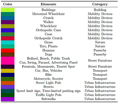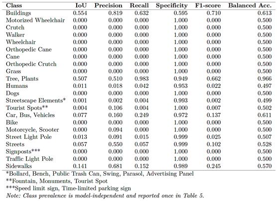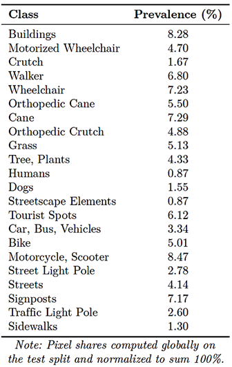 Table 5 reports pixel-level prevalence for each class on the test split, normalized to 100%. Dominant classes, including Buildings, Streets, and street-adjacent vegetation, account for most pixels, whereas mobility devices and small infrastructure elements constitute ultraminority. |