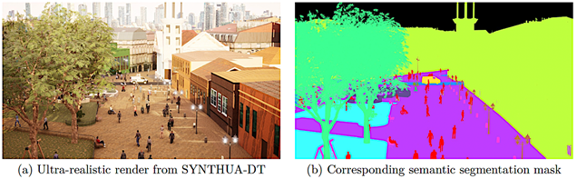 Figure 1. Example SYNTHUA-DT pair: (a) high-fidelity RGB image; (b) pixel-perfect semantic mask. |