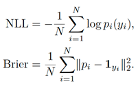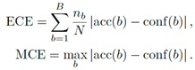 Global scores are macro-averaged over classes. Calibration and probabilistic metrics. Expected Calibration Error (ECE), Maximum Calibration Error (MCE), Negative Log-Likelihood (NLL), and Brier score are computed. With B confidence bins and nb predictions in bin b, see equation (6):