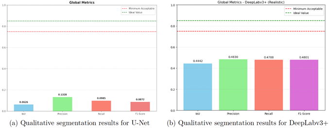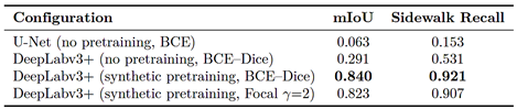 To disentangle the impact of architecture and loss design, Table 4 reports an ablation study including U-Net, DeepLabv3+ without synthetic pretraining, and DeepLabv3+ with synthetic pre-training using either BCE–Dice or Focal-based composite losses. DeepLabv3+ without pre-training already outperforms U-Net achieving an mIoU of 0.291, whereas synthetic pre-training increases mIoU to 0.840 and raises sidewalk recall from 0.531 to 0.921. The Focal-based variant attains a similar mIoU of 0.823, with slightly higher recall for some rare classes; however, BCE–Dice provides the best overall trade-off. Figures 2a and 2b visually corroborate these trends: U-Net produces fragmented masks, whereas DeepLabv3+ yields coherent, fine-grained predictions with clear object boundaries. |