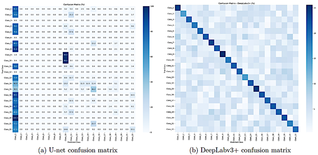 Figure 3. Comparison of confusion matrices between U-Net and DeepLabv3+. U-Net shows strong bias toward dominant classes, whereas DeepLabv3+ produces more accurate and differentiated predictions. |