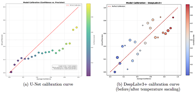 Figure 7. Comparison of model calibration for U-Net and DeepLabv3+. Curves relate predicted confidence to empirical precision (see ECE/MCE definitions in Section 2.6). |