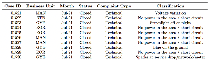 An institutional database from CNEL EP was compiled, comprising 143,113 historical records of technical complaints. Each record contains variables such as |