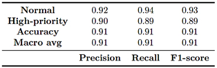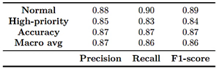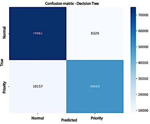The Random Forest model outperformed the Decision Tree, confirming its stronger ability to capture nonlinear patterns and mitigate overfitting. Table 5 summarizes the results, showing an overall accuracy of 91% with balanced performance across both classes. The normal category achieved a precision of 0.92, a recall of 0.93, and an F1-score of 0.92, while the highpriority category recorded a precision of 0.90, a recall of 0.89, and an F1-score of 0.89.
